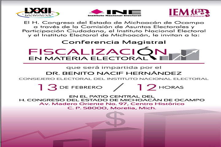 Como parte del compromiso de los órganos electorales para brindar certeza y equidad, así como garantizar el transparente ejercicio de los recursos de los partidos políticos, el Consejero del Instituto Nacional Electoral (INE) Benito Naif Hernández brindará una conferencia magistral sobre fiscalización en materia electoral este viernes, a las 12 horas, en el patio del Congreso del Estado.