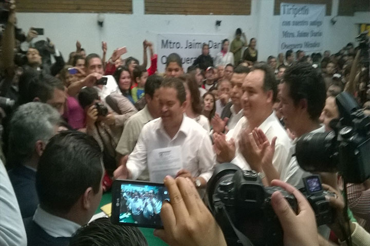 NOTICIAS 24/01/2015Se registra Jaime Darío como precandidato Fue pasada las doce y media de este sábado cuando Jaime Darío Oseguera Méndez acompañado de otros tres aspirantes del PRI hizo su solicitud de registro como candidato a la presidencia municipal de Morelia y pregonar la unidad.