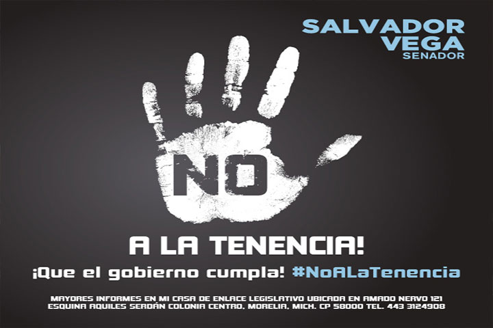 NOTICIAS 08/12/2014Salvador Vega reanuda su campaña en contra de la tenencia El oponerse y denunciar las malas decisiones que realiza el gobierno del estado nada tiene que ver con un proceso electoral, tal situación quedó ratificada por el pleno del Tribunal Electoral del Estado de Michoacán (TEEM), quien emitió su fallo a favor de la campaña ?No Más Tenencia', afirmó el senador Salvador Vega Casillas.