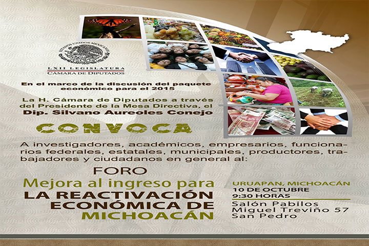 NOTICIAS 10/10/2014Preside Silvano foro sobre mejora del salario mínimo en Uruapan Como presidente y representante del Congreso de la Unión, Silvano Aureoles Conejo, dio formal inauguración a los trabajos del foro realizados en esta ciudad denominado La mejora del ingreso para la reactivación económica de Michoacán, donde destacó que el interés es "escuchar y conocer que podemos hacer para contribuir a que mi estado dé el siguiente paso y tengamos una mejor condición en medio de dificultades económicas muy fuertes y d... Ver más...