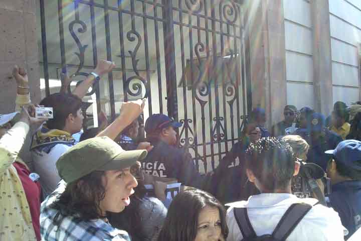 Después de 3 horas de espera el presidente de la Mesa Directiva del Congreso local, Fidel Calderón Torreblanca asistió al recinto legislativo que fue cerrado el acceso por la manifestación convocada por el Movimiento de Regeneración Nacional en el estado (Morena) y otros actores políticos de izquierda en contra de la Reforma Energética.