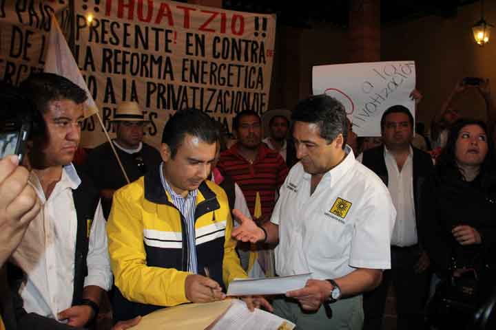 El presidente de la Mesa Directiva de la LXXII Legislatura, Fidel Calderón Torreblanca, recibió a los manifestantes que arribaron este día al Congreso de Michoacán, para hacer del conocimiento de los diputados la postura del Partido de la Revolución Democrática, ante las reformas realizadas a los artículos 25, 27 y 28 de la Constitución Política de los Estados Unidos Mexicanos.
