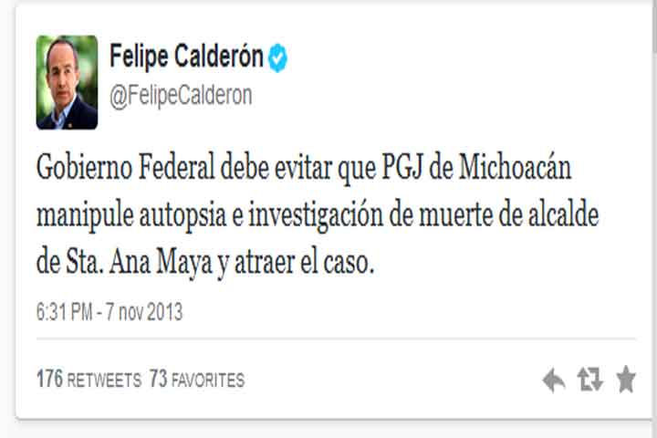 El ex presidente Felipe Calderón, pidió que el Gobierno Federal atraiga el caso de Ygnacio López Mendoza, presidente municipal de Santa Ana Maya, Michoacán, quien murió durante las primeras horas de este jueves en un accidente automovilístico.