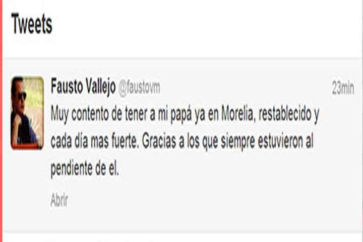 A través de la red social Twitter, Fausto Vallejo Mora anunció el regreso su padre a la capital michoacana, Fausto Vallejo Figueroa, quien se ha mantenido alejado del cargo de Gobernador por motivos de salud.