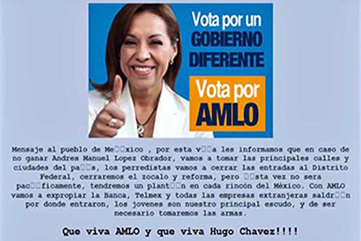 NOTICIAS 11/06/2012Juan Ignacio Zavala califica de "sucio" el hackeo a página de Vázquez MotaEl vocero de la campaña de la candidata presidencial del PAN, Josefina Vázquez Mota, Juan Ignacio Zavala, calificó como una "herramienta muy sucia" el hackeo que desde esta madrugada afecta la página de Internet de la panista.