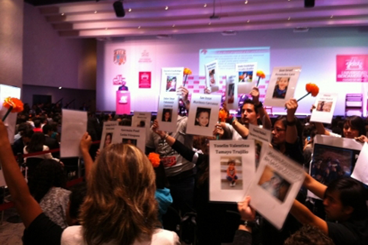 Dentro del auditorio en el que realiza su ponencia, algunos alumnos muestran fotos de los niños fallecidos y portan flores de cempasúchil. Afuera del recinto, otro grupo de alumnos entregó 200 libros que hablan sobre el ... Ver más...