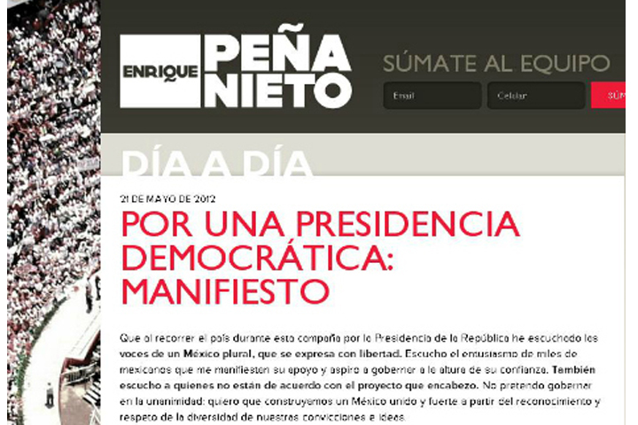 NOTICIAS 21/05/2012Publica Peña Nieto manifiesto "por una Presidencia democrática"El candidato presidencial del PRI-PVEM, Enrique Peña Nieto, publicó este lunes en su página oficial su manifiesto "por una Presidencia democrática".