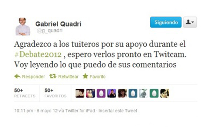 NOTICIAS 07/05/2012Duplica Quadri su número de seguidores en redes sociales a raíz del debateEl candidato de Nueva Alianza Gabriel Quadri duplicó su número de seguidores en redes sociales, durante el debate organizado por el IFE. Inició con 56 mil 574 seguidores en Twitter y 15 mil 569 en Facebook, para finalizar con 100 mil 249 y 35 mil 155, respectivamente.