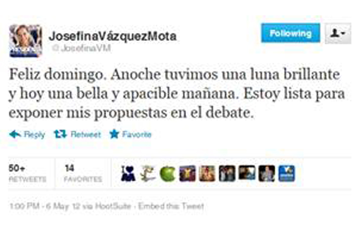 NOTICIAS 06/05/2012Vázquez Mota asegura a través de Twitter está lista para el debateLa candidata presidencial del PAN, Josefina Vázquez Mota, se dijo lista para exponer sus propuestas durante el debate que se celebrará hoy a los 20:00 horas con los cuatro candidatos presidenciables en el World Trade Center.