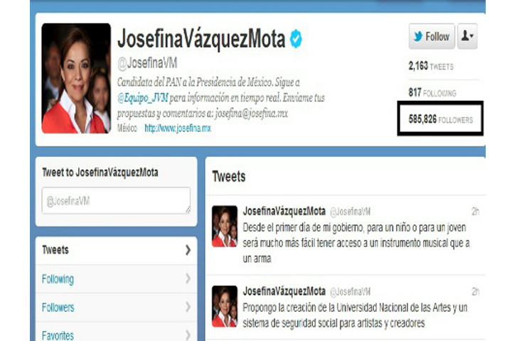 El perfil de Josefina suma alrededor de 585 mil seguidores hasta este momento, mientras que la de Peña Nieto alcanza los 549 mil, quedando como la presidenciable con más seguidores en Twitter.