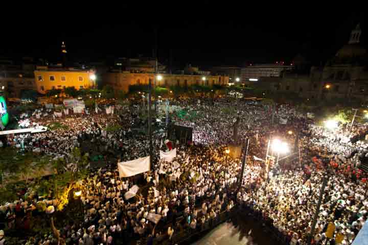NOTICIAS 30/03/2012Recuperar la Paz para México: EPNEl miedo y la paz fueron los conceptos centrales en el discurso de Enrique Peña Nieto durante el arranque de su campaña en la Plaza de la Liberación, en el corazón de Guadalajara. El simbólico espacio estaba repleto de priistas vestidos de blanco, el color para realzar el mensaje del candidato presidencial.