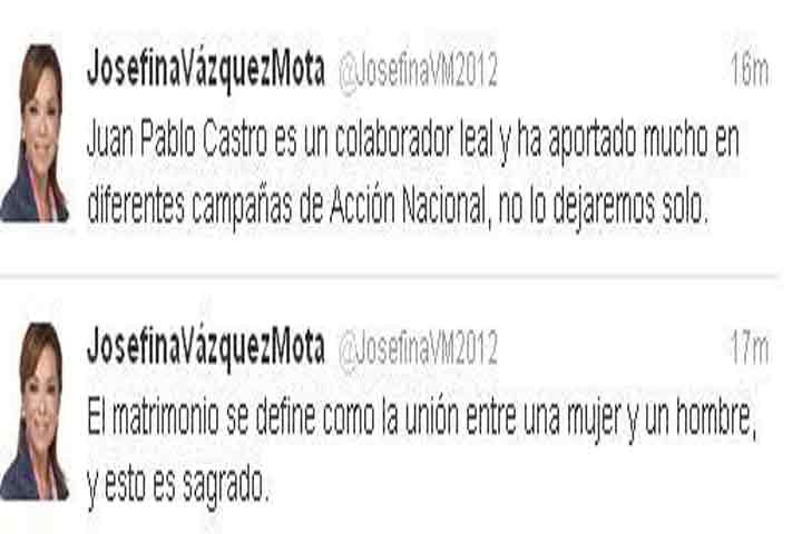 NOTICIAS 09/03/2012Cuenta en twitter de Vázquez Mota apoya declaraciones de Juan Pablo CastroTras las declaraciones del joven panista, Juan Pablo Castro donde acusa al PRD de destruir todas las instituciones, y permitir el matrimonio entre "jotos" en el Distrito Federal, la cuenta en twitter de mujeres que apoyan a Josefina Vázquez Mota ha mostrado su apoyo a Castro.