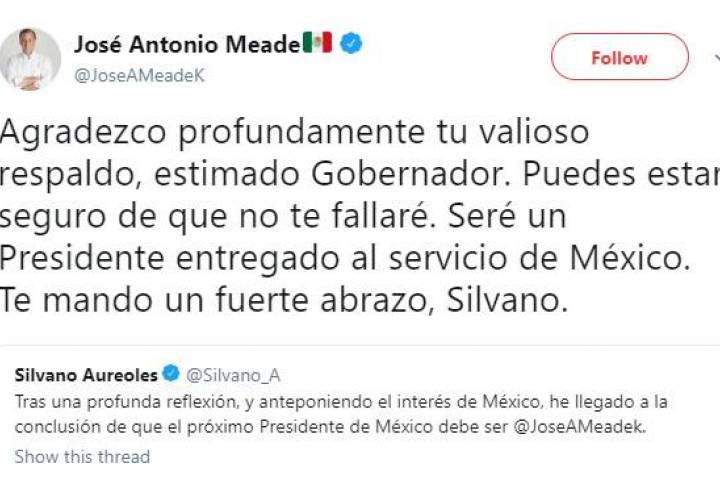 José Meade Kuribreña, candidato a la presidencia de México, por el Partido Revolucionario Institucional (PRI) y Partido Verde Ecologista de México (PVEM), agradeció el apoyo de Silvano Aureoles Conejo a su campaña.