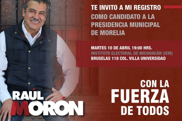 NOTICIAS 09/04/2018Este martes se registra Raúl Morón por la alcaldía de Morelia por Morena y el PTRaúl Morón Orozco se registrará este martes 10 de abril ante el Instituto Electoral de Michoacán (IEM) como candidato a la presidencia municipal de Morelia por los partidos Morena y PT.