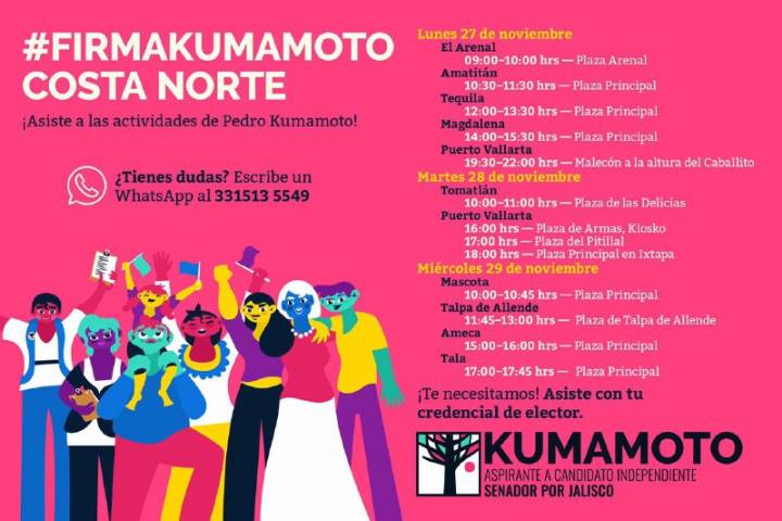 NOTICIAS 26/11/2017Kumamoto en la cota norte de JaliscoPedro visitará este lunes 27, martes 28 y miércoles 29 de noviembre la costa norte del estado de Jalisco, recorriendo Puerto Vallarta, el Arenal, Amatitán, Tequila, Magdalena, Tomatlán, Mascota, Talpa de Allende, Ameca y Tala.