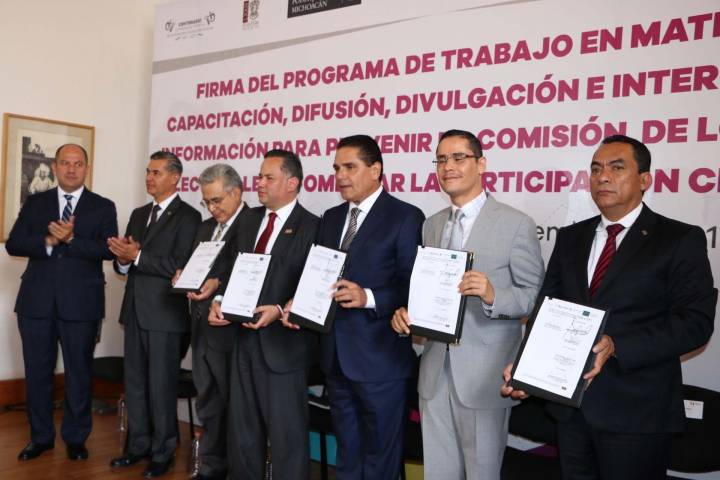 El Gobernador del Estado, Silvano Aureoles Conejo, el Presidente del Supremo Tribunal de Justicia, Marco Antonio Flores Negrete y el Presidente de la Mesa Directiva del Congreso del Estado Miguel Villegas Soto, asà como el Titular de la Fepade Santiago Nieto Castillo, firmaron Programa de Trabajo en Materia de Capacitación, Difusión, Divulgación e Intercambio de Información para Prevenir la Comisión de los Delitos Electorales y Fomentar l... Ver más...