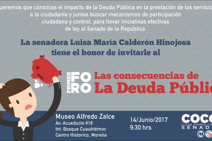 La Senadora Luisa María Calderón Hinojosa, inauguró este miércoles el Primer Foro "Las Consecuencias de la Deuda Pública", con el que, dijo, pretende que la sociedad conozca los alcances de las decisiones que, tanto el gobierno estatal como los diputados locales, han tomado en torno a las finanzas michoacanas.