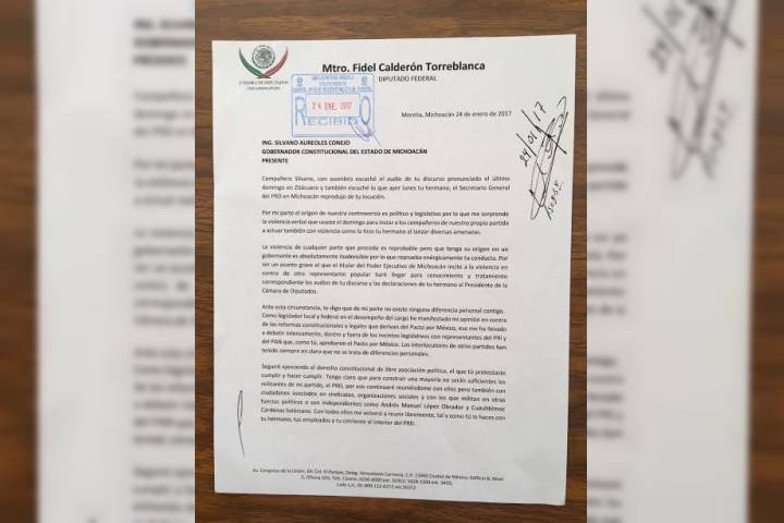 NOTICIAS 24/01/2017Exige Fidel a Silvano respeto y concentrarse en su trabajoEl diputado federal Fidel Calderón Torreblanca, solicitó al Ejecutivo Estatal, Silvano Aureoles Conejo, conducirse con respeto, evitar la violencia y centrar su atención en sus labores de gobierno. Luego de los señalamientos vertidos por el mandatario michoacano y replicados por su hermano, el legislador le hizo llegar una carta en donde fija su postura política al respecto.