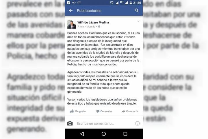 En la publicación del legislador se puede leer: "Buenas noches. Confirmo que es mi sobrino, él es uno más de todos los michoacanos que están viviendo una desgracia a causa de la inseguridad que pre... Ver más...