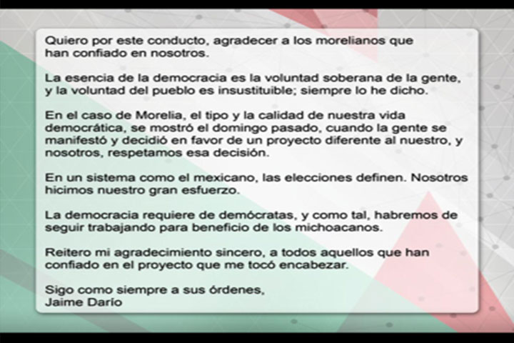 NOTICIAS 09/06/2015Con agradecimiento, Jaime Darío reconoce derrota Con un agradecimiento publicado en sus redes sociales, Jaime Darío Oseguera Méndez, aspirante priista a la alcaldía de Morelia, reconoció su derrota tras señalar que "la gente se manifestó y decidió en favor de un proyecto diferente al nuestro, y nosotros, respetamos esa decisión".
