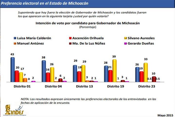 NOTICIAS 25/05/2015Encabeza Luisa María las encuestas con 30%, según encuesta de IndesA 13 días de que se lleve a cabo la contienda electoral, la candidata del Partido Acción Nacional (PAN) al Gobierno del Estado, Luisa María Calderón Hinojosa encabeza las encuestas con un 30 por ciento de la preferencia electoral, este ejercicio fue realizado por la empresa Indes en un en la cual se toma en cuenta la intención del voto y no la percepción como lo han venido manejando otras casas encuestadoras.