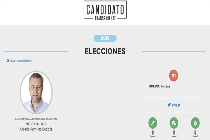 NOTICIAS 23/05/2015Alfredo Ramírez, primer candidato de Morelia en declarar sus bienes patrimonialesAlfredo Ramírez Bedolla, candidato de Morena a la presidencia municipal de Morelia, declaró que fue el primero en presentar sus declaraciones patrimoniales, de tres por tres, ante el Portal de Transparencia Mexicana.