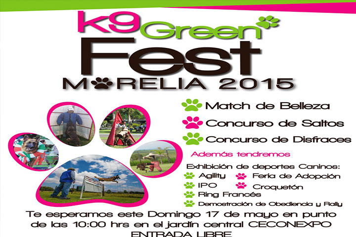 Con la finalidad de sensibilizar a los morelianos, comprometerlos con causas nobles como adoptar a un animal no humano y recabar comida para perros rescatados, organizaciones de veterinarios y animalistas invitan al K9 Green Fest, Morelia 2015, a realizarse este domingo 17 de mayo, a partir de las 10 de la mañana, en el jardín central del Centro de Convenciones y Exposiciones de Morelia.