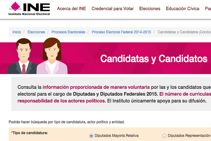 NOTICIAS 11/05/2015En Michoacán sólo 12A 29 días de la Jornada Electoral, el Instituto Nacional Electoral (INE) tiene disponible en el apartado Candidatas y Candidatos ¡Conócelos!, de la página de Internet www.ine.mx, información y trayectoria de 12 candidatas y candidatos a diputados federales por el principio de mayoría relativa, por el estado de Michoacán.