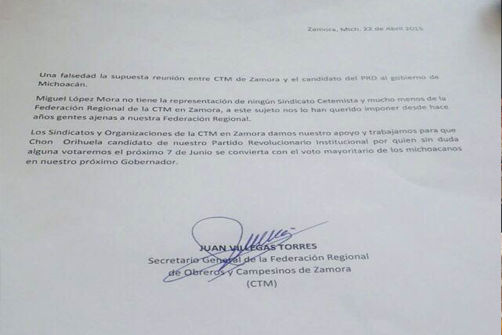 NOTICIAS 23/04/2015Líder de CTM en Zamora desmiente a SilvanoFue una falsedad la supuesta reunión entre los integrantes y el presunto líder de la Federación Regional de Obreros y Campesinos de Zamora (CTM) con el candidato de Godoy, así lo afirmó Juan Villegas López secretario general de este sector.