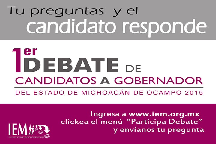 NOTICIAS 14/04/2015Concluye plazo para recibir preguntas de ciudadanos para el Debate entre candidatos a gobernadorEste miércoles vence el plazo para que los ciudadanos hagan llegar sus preguntas al Instituto Electoral de Michoacán (IEM), mismas que serán clasificadas en tres grandes temas y 26 subtemas para que las y los candidatos a Gobernador respondan las inquietudes de los michoacanos en el debate a desarrollarse el próximo 29 de abril.