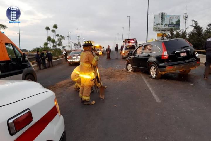 El percance sucedió durante la mañana de este domingo sobre uno de los puentes de la citada vialidad, cerca de la Macroplaza Estadio. Se apreció que uno de los automotores involucrados es de la marca Toyota, color arena; la otra unidad es una Honda negra.