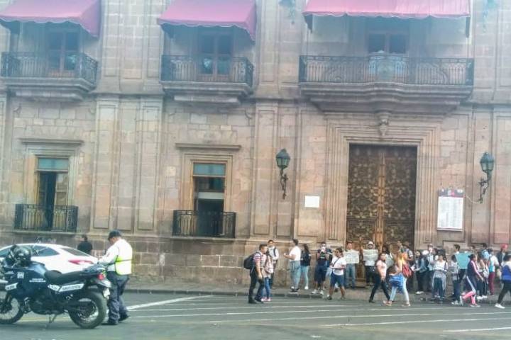 Ante la presencia de manifestantes, elementos de la Policía Michoacán vigilan la zona Centro, a la altura del Congreso del Estado de Michoacán.