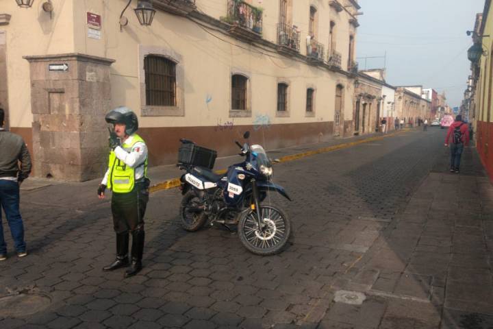 Elementos de la Policía Michoacán en coordinación con Tránsito y Movilidad, brindan atención vial a peatones y conductores sobre la avenida Francisco I. Madero, a la altura de la Plaza Morelos.