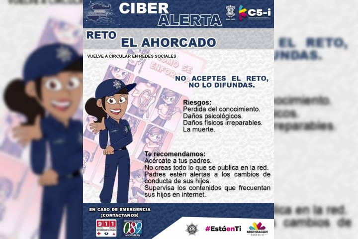 NOTICIAS 21/03/2019Alerta Unidad Cibernética a usuarios, por resurgimiento de reto viralLa Unidad Cibernética de la Secretaría de Seguridad Pública de Michoacán (SSP), alerta a padres de familia a vigilar el acceso de sus hijos a redes sociales, ante el resurgimiento del peligroso reto virtual llamado "El Ahorcado".