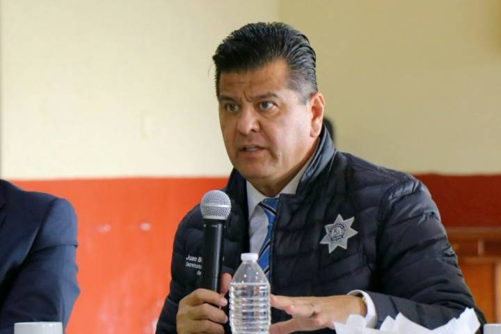 El titular de la SSP, Juan Bernardo Corona Martínez, acompañado del subsecretario de la institución, Carlos Gómez Arrieta; el director de Seguridad Pública, Venancio Colín Mendoza, y el ... Ver más...