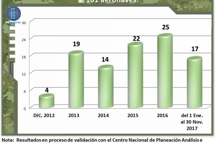 NOTICIAS 16/12/2017Se incrementan golpes a la movilidad del narco en este sexenioEn el más reciente reporte de la Secretaría de la Defensa Nacional que refiere que en las operaciones realizadas del 1 de diciembre de 2012 al 30 de noviembre de 2017 se aseguraron más vehículos terrestres y aeronaves que durante todo el sexenio pasado.