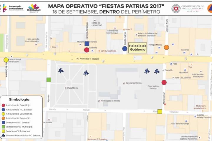 NOTICIAS 15/09/2017PC Estatal, listo para eventos de festejos patriosCon el propósito de salvaguardar la integridad física de los visitantes de procedencia regional, nacional y extranjera, durante los festejos de Independencia de México en la zona del centro histórico y sus alrededores de la ciudad de Morelia, la Secretaría de Gobierno a través de la Coordinación de Protección Civil mantendrá un operativo durante los días viernes 15 y sábado 16.
