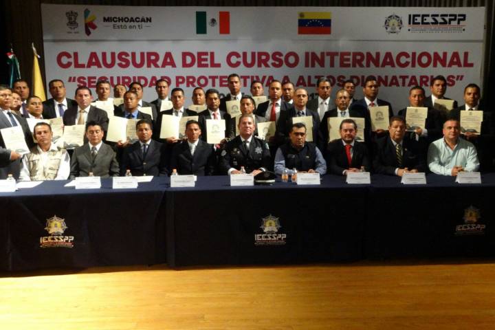 El director general del Instituto Estatal de Estudios Superiores en Seguridad y Profesionalización Policial del Estado de Michoacán (IEESSPP), J. Antonio Bernal Bustamante, en compañía de distintos funcionarios del estado, así como de los instructores especialistas en seguridad provenientes de la República Bolivariana de Venezuela; el Coronel Eduardo Muñoz Cuenca y el Mayor Williams Rodolfo Chirino Peña, encabezó la ceremonia de clausu... Ver más...