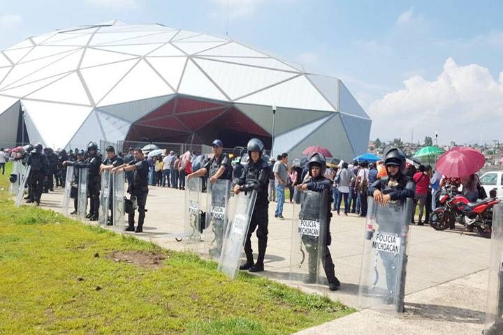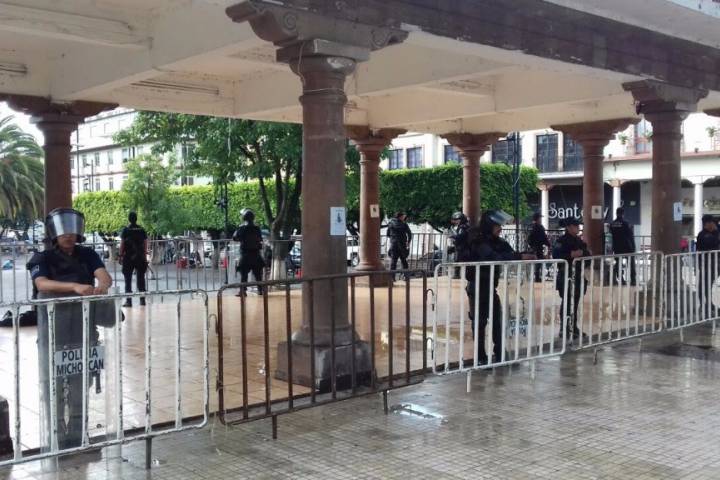 Con presencia policial y patrullajes que realizan elementos de la Policía Michoacán en coordinación con autoridades federales, se resguardan las sedes donde se efectúa el pago de salarios a profesores, para garantizar su seguridad.