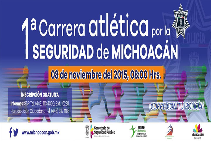 NOTICIAS 29/10/2015SSP invita a la 1ra. Carrera Atlética por la SeguridadComo parte de las estrategias de proximidad social y con la finalidad de propiciar una sana convivencia con la ciudadanía, la Secretaría de Seguridad Pública de Michoacán en coordinación con la Comisión Estatal para la Cultura Física y Deporte (Cecufid) y la Asociación Michoacana de Atletismo, convocan a la Primera Carrera Atlética por la Seguridad de Michoacán 2015, denominada "Corre con tu Policía".