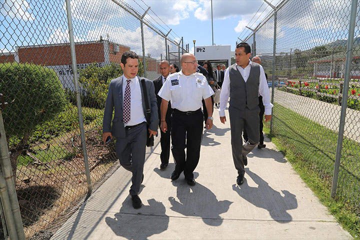 Con la finalidad de verificar las condiciones en que se encuentran los internos del CE.RE.SO. "David Franco Rodríguez" (Mil Cumbres), el Secretario de Seguridad Pública del Estado de Michoacán, Lic. Víctor Manuel Magaña García, y el Subsecretario de Prevención y Reinserción Social de la SSP Michoacán, Jorge Alejandro Montiel Villaseñor, hicieron un recorrido por las instalaciones del penal.