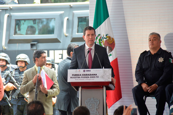 NOTICIAS 18/08/2014Con instituciones sólidas Michoacán avanza en seguridad: Castillo Siete meses después de iniciar las acciones del Gobierno de la República en el estado, inicia la nueva etapa con Fuerza Ciudadana, la nueva unidad de policía estatal para garantizar la tranquilidad y mejorar la seguridad de los michoacanos, señaló Alfredo Castillo Cervantes, Comisionado para la Seguridad y Desarrollo Integral de Michoacán.