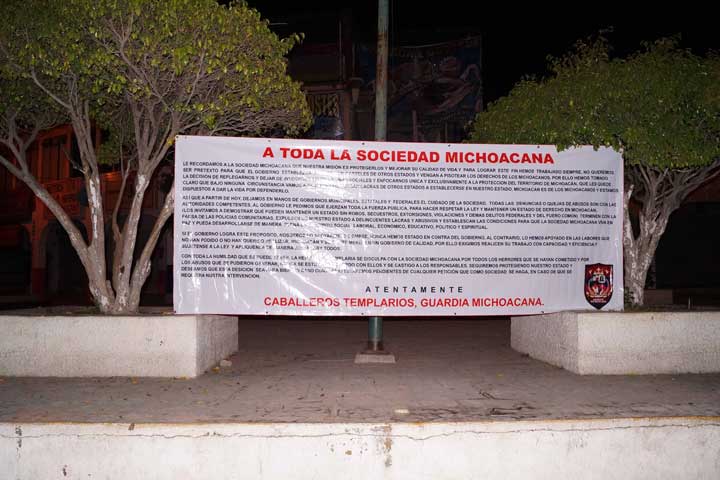 El grupo autodenominado Los Caballeros Templarios, anunciaron a través de lonas que colocaron en puentes y otros puntos de todo el Estado, que se replegarán para no intervenir en problemas de tipo social y sólo cuidarán que grupos delictivos no entren a Michoacán, agregando que a partir de hoy miércoles dejan en manos de los gobiernos municipal, estatal y federal el cuidado de la sociedad.