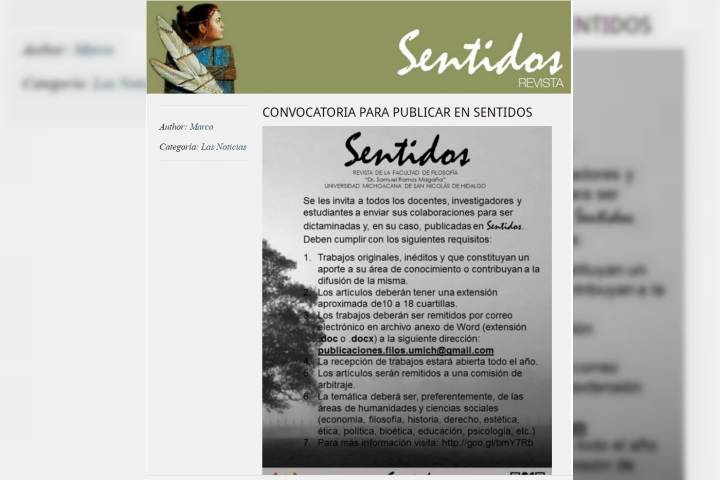 NOTICIAS 19/02/2017Revista Sentidos de la Casa de Hidalgo prepara siguiente ediciónLa Facultad de Filosofía "Dr. Samuel Ramos Magaña" de la Universidad Michoacana de San Nicolás de Hidalgo invita a docentes, investigadores y estudiantes a participar con sus colaboraciones a fin de ser publicadas en su revista académica "Sentidos".