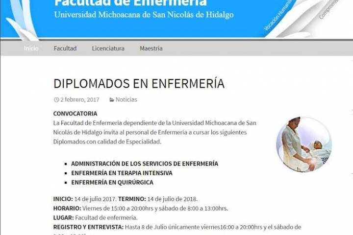 Para contribuir al fortalecimiento de la formación profesional en el área de EnfermerÃa, proceso basado en competencias que satisfagan las necesidades especÃficas del cuidado en el área de especialización, la Facultad de EnfermerÃa de la Universidad Michoacana de San Nicolás de Hidalgo (UMSNH) pone a disposición de los interesados, la nueva convocatoria para sus Diplomados con calidad de Especialidad.