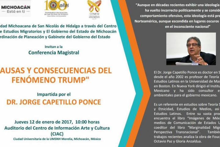 "Causas y consecuencias del fenómeno Trump", es el nombre de la conferencia magistral que será presentada por el sociólogo Jorge Capetillo Ponce en la Universidad Michoacana de San Nicolás de Hidalgo, este jueves 12 de enero, y donde se analizarán los efectos sobre la llegada del nuevo presidente de los Estados Unidos de Norteamérica.