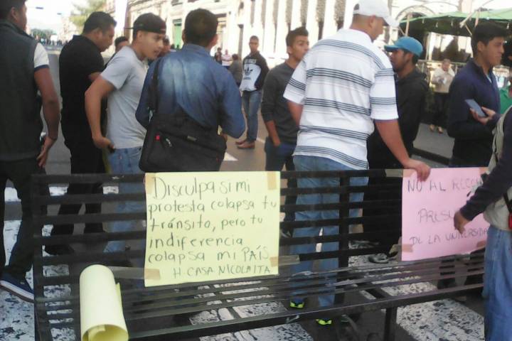 Agremiados a la Coordinadora de Universitarios en Lucha (CUL) protestan en el primer cuadro de la ciudad sobre la avenida Madero en contra del recorte al presupuesto de la Universidad Michoacana.