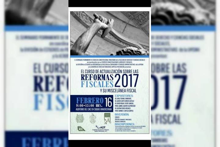La Universidad Michoacana de San Nicolás de Hidalgo a través de su Facultad de Derecho y Ciencias Sociales en coordinación con el Centro de Investigaciones JurÃdicas y Sociales (CIJUS), la División de Estudios de Posgrado de la Facultad de ContadurÃa y ciencias Administrativas, asà como la Academia de Derecho Tributario CapÃtulo Michoacán, impartirán un curso de actualización sobre las Reformas Fiscales 2017 y su miscelánea fiscal.