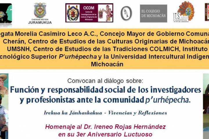 En ocasión del tercer aniversario de su desaparición fÃsica, el nicolaita Ireneo Rojas Hernández será homenajeado el próximo viernes 16 de diciembre en la población de Cherán, su tierra natal, a través del diálogo sobre "Función y responsabilidad social de los investigadores y profesionistas ante la comunidad Purépecha".