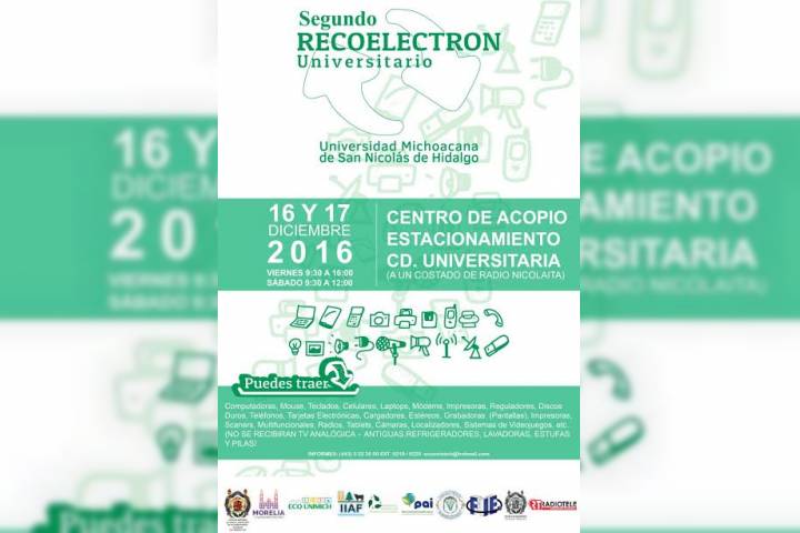 Para contribuir al ordenamiento integral de los residuos clasificados como de "Manejo Especial-Peligrosos", Instituto de Investigaciones Agropecuarias y Forestales de la Universidad Michoacana de San Nicolás de Hidalgo, realizará este fin de semana su "Recoelectrón Universitario", una actividad de acopio y reciclado de residuos eléctricos y electrónicos, que reafirma la responsabilidad social y ambiental de la Casa de Hidalgo y contribuye ... Ver más...